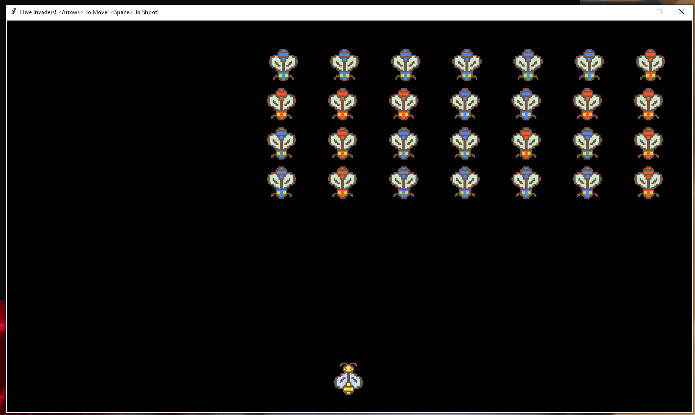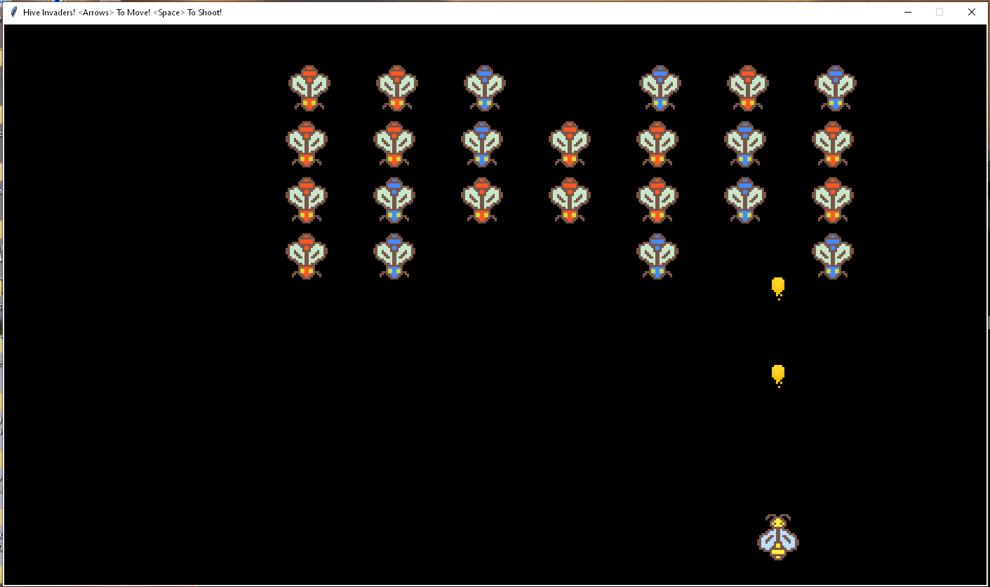 Two dimensional game based on Space Invaders. The player controls a yellow bee at the bottom of the screen that can shoot projectiles, while red and blue enemy bees come down from the top of the screen towards you.